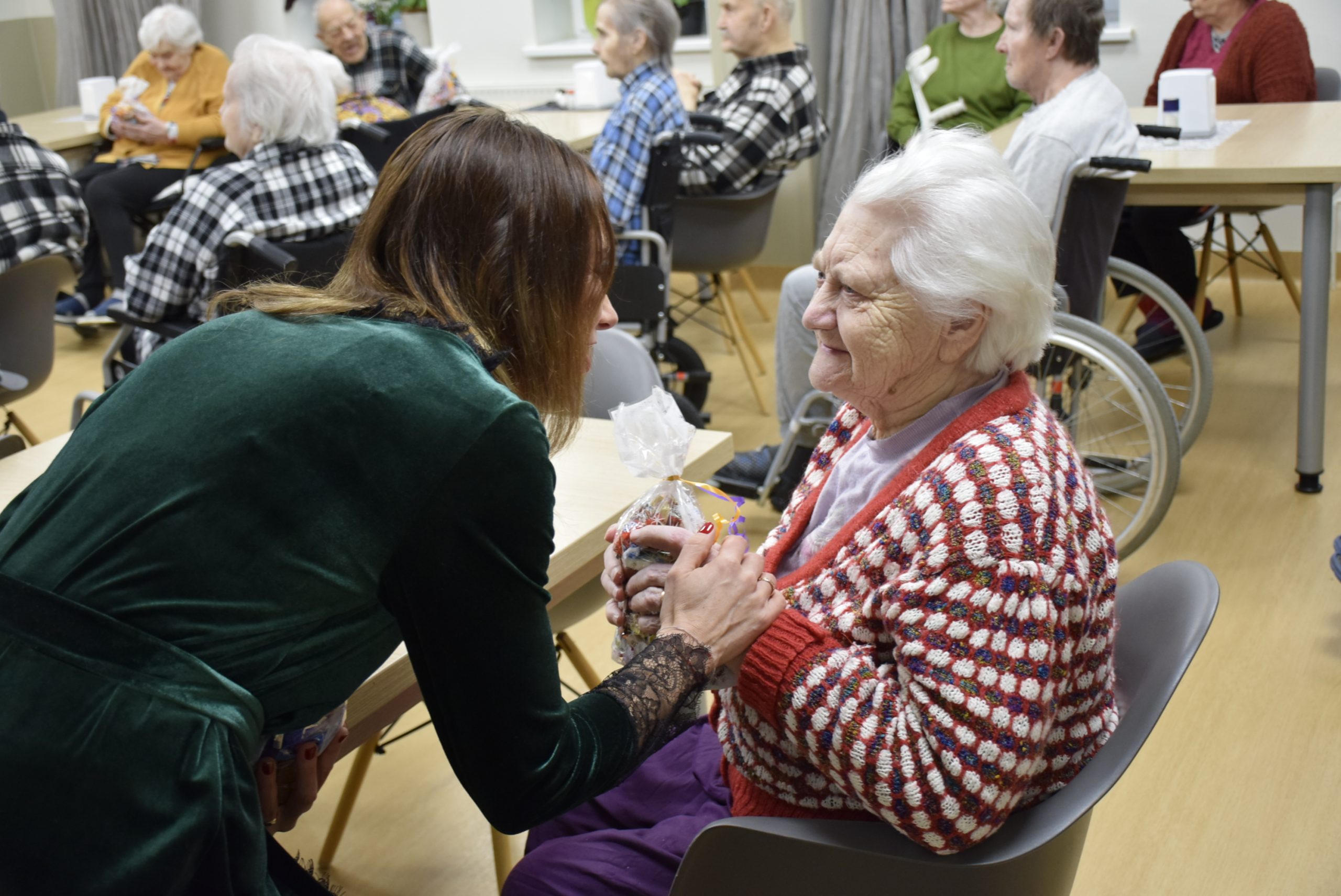 Katrs nodaļas iedzīvotājs tika iepriecināts ar saldumu paciņu, svētku dzejoļiem un jaukām dziesmām. Kuldīgas novada pašvaldības Izpilddirektora vietniece Agnese Buka: “Jūs, mīļie seniori, šajā svētku laikā esat tie, kas palīdz mums apstāties un sajust Ziemassvētku mieru. Mēs no Jums to kopīgi mācāmies, jo Jūsos ir dzīves gudrība, sirds siltums un došanas prieks. Par to paldies!”