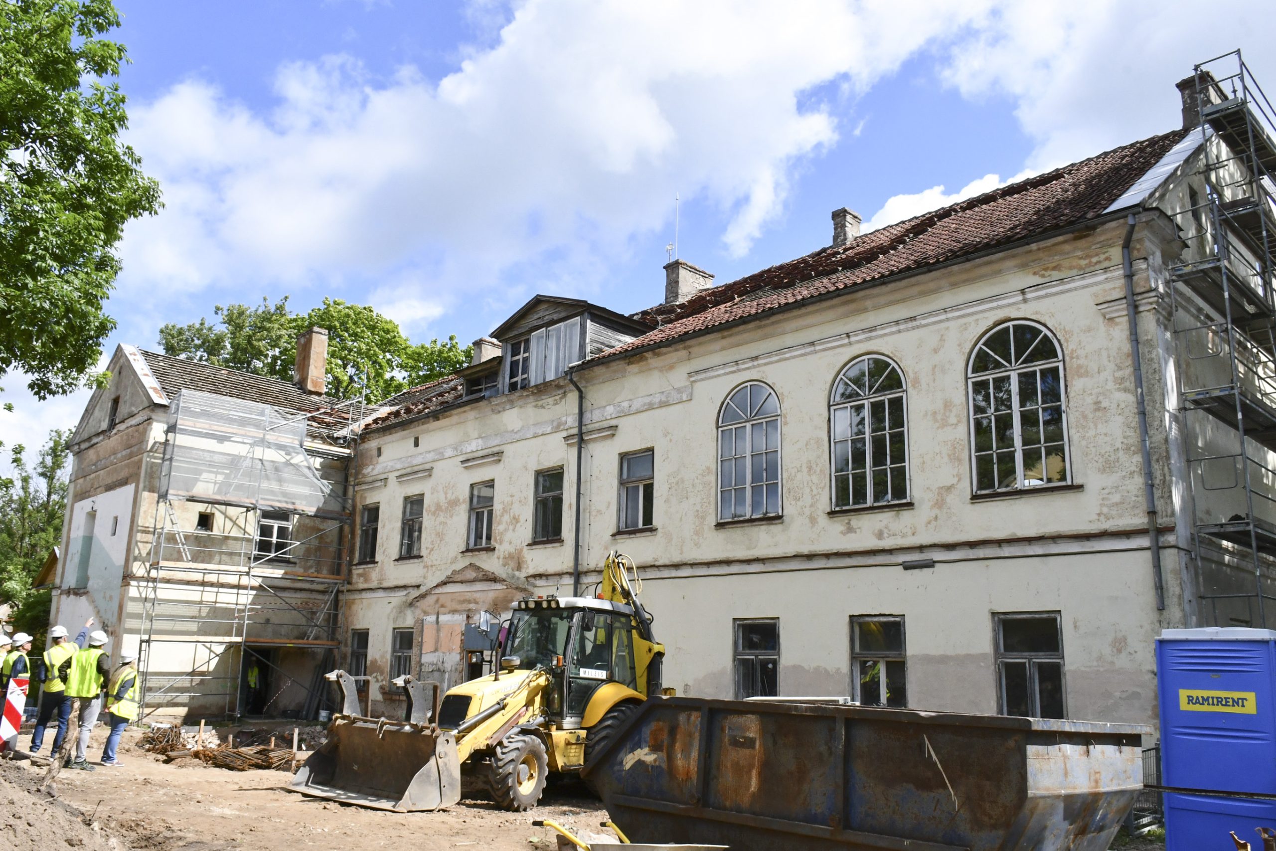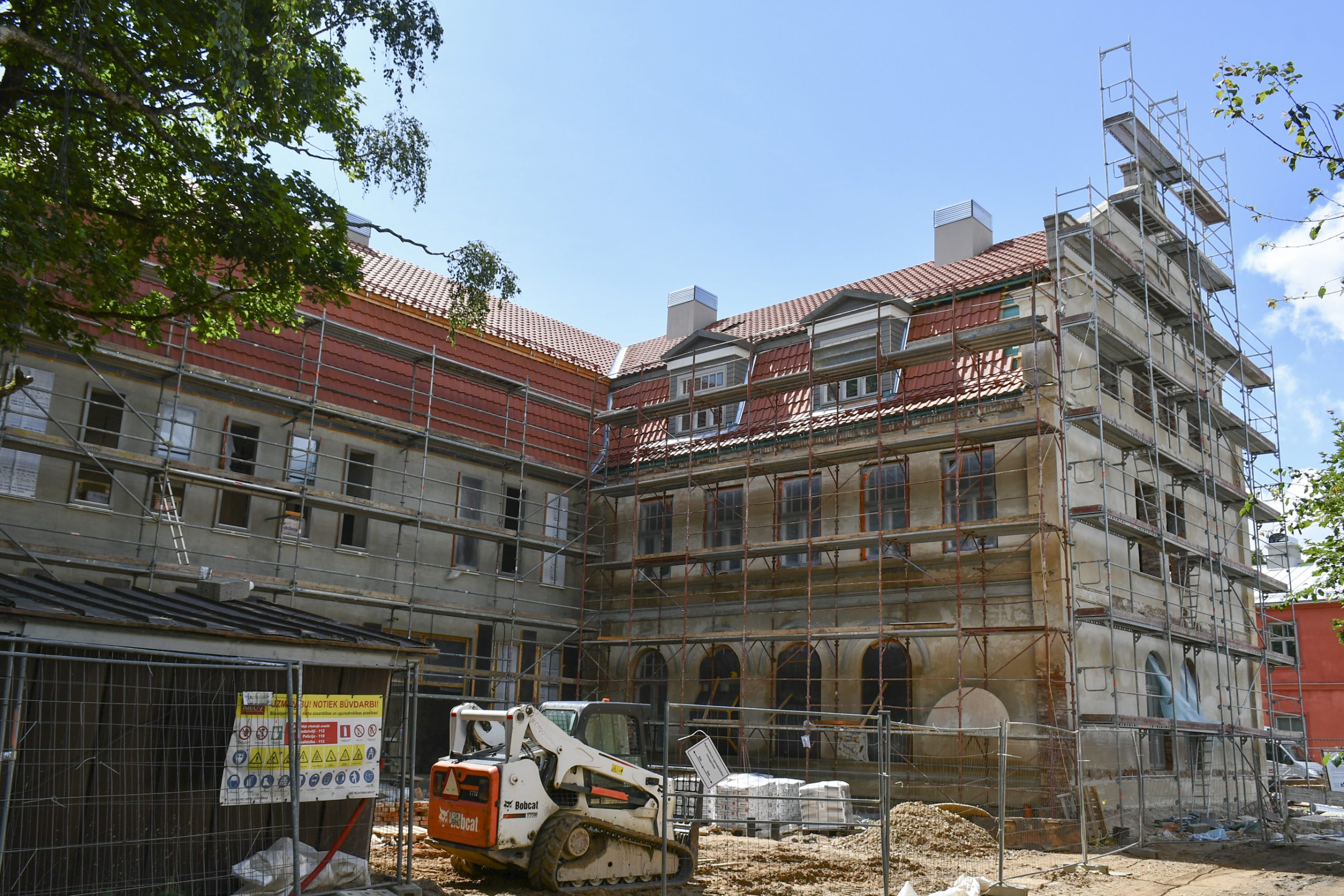 Objektā jau ir veikta esošo pamatu vertikālā hidroizolācija ar injekcijas metodi, mikropāļu izbūve, pamatu aizmūrēšana ar laukakmeņiem, un šobrīd notiek sagatavošanas darbi jumta seguma demontāžai.