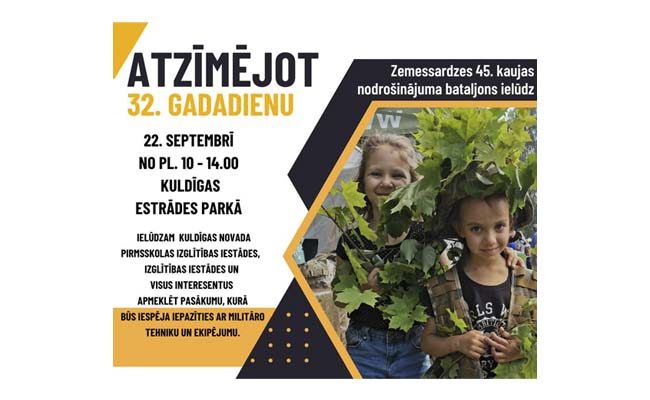 Piektdien, 22. septembrī plkst. 10.00 Kuldīgas estrādes parkā Zemessardzes 45. kaujas nodrošinājuma bataljons ielūdz visus interesentus apmeklēt bataljona 32. gadadienai veltītu pasākumu. Pasākuma laikā būs iespēja piedalīties dažādās aktivitātēs, kā arī aplūkot Zemessardzes tehnikas vienības, ekipējumu un iepazīties ar karavīru un zemessargu ikdienu. Lai veidotu kopīgu atmiņu kolāžu, aicinām svētku apmeklētājus ņemt līdzi izveidotu vai uzzīmētu apsveikumu bataljonam gadadienā.